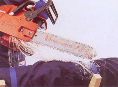 そして、チェンソーか安全ズボンに当たった瞬間、ソーチェンの刃がズボンの中のプロテクターに食い込み、長い繊維が刃からドライブギヤに絡まり、ソーチェンの駆動を瞬時に止めてしまいます。