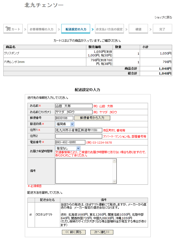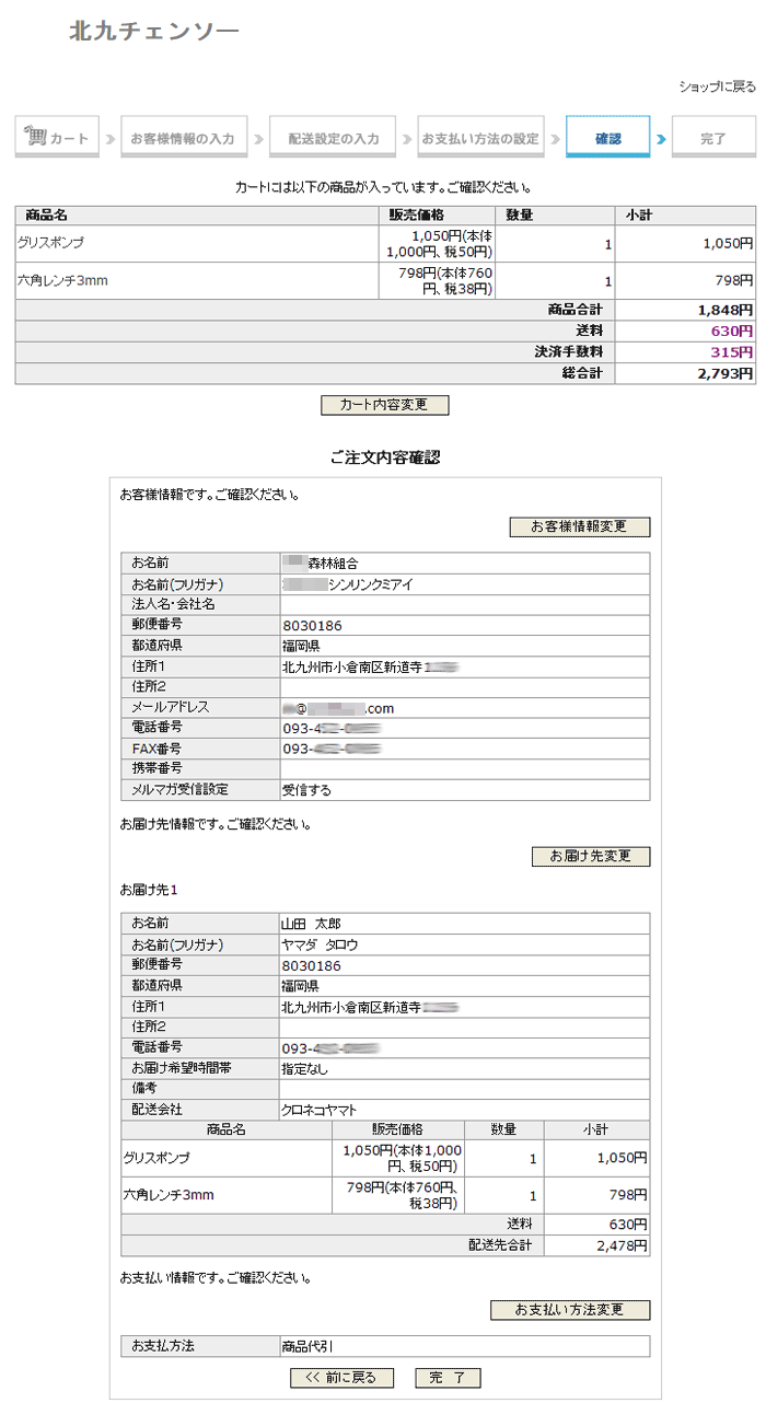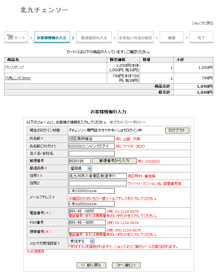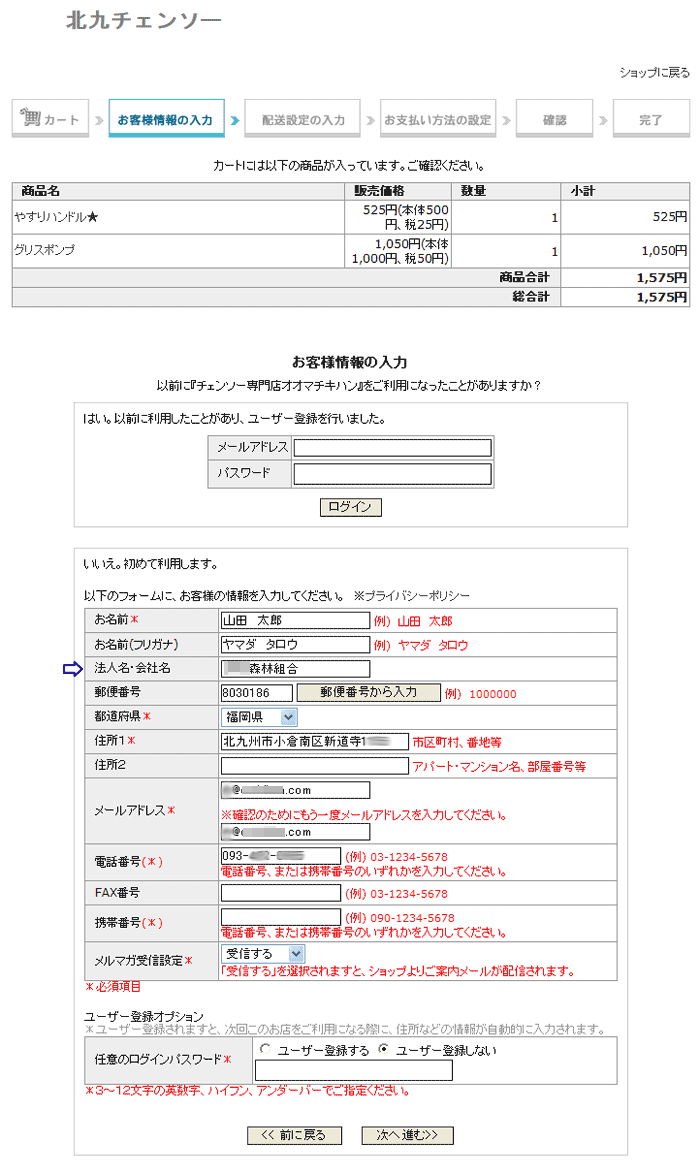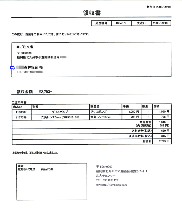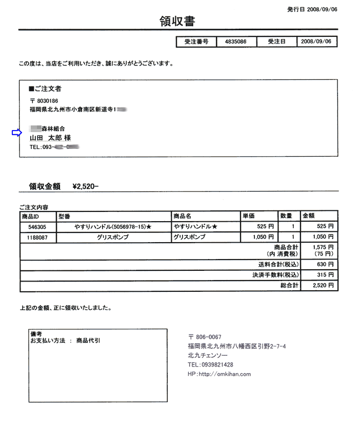 @会社名で領収書がほしい場合は次のようにしてください。 (個人名も記載されます個人名記載しない方法は下記Aを参照) お客様情報入力時に『法人名・会社名』の欄に会社名または団体名を入力してください。 ![]() 上記のように入力した場合は次のような領収書が発行されます。 会社名と個人名が記入となります。 ![]() A会社名だけで領収書がほしい場合 下記のように、お客様情報入力時に『お名前』の欄に会社名、団体名を入力してください。 (住所なども会社の住所でかまいません) ![]() 配送先が会社・団体ではない場合は、配送先を入力してください。 商品は配送先へ配送します。 ![]() ご注文内容確認でお客様情報が会社・団体名か確認してください。 お届け先情報で配送先を確認してください。 商品の配送はお届け先情報の住所となります。 ![]() 領収書は会社名・団体名になります。 住所もお客様情報で入力したものが記入されます。 ![]() |