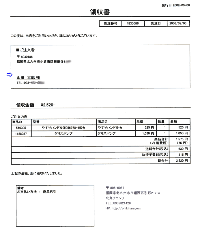 領収書は下記のようになります。 ![]() |